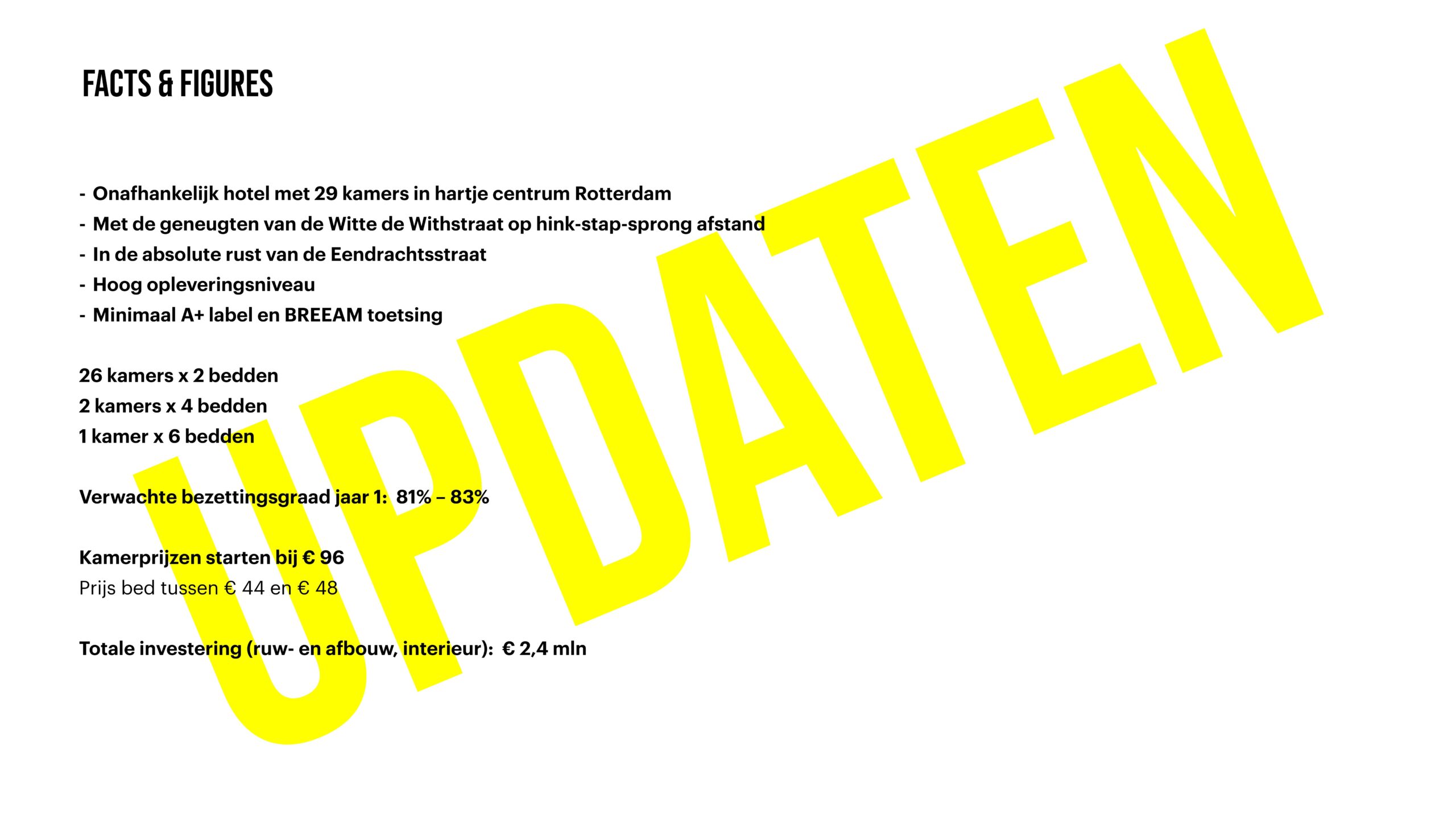 Het gaat om een casco bedrijfsruimte met de mogelijkheid voor het realiseren van een hostel in het centrum van Rotterdam. Er is een omgevingsvergunning afgegeven voor het ontwikkelen van een Hostel dat bestaat uit 5 bouwlagen en is gelegen op de begane grond, 1e, 2e, 3e, 4e verdieping en kapverdieping. Het hostel heeft 120 slaapplaatsen.